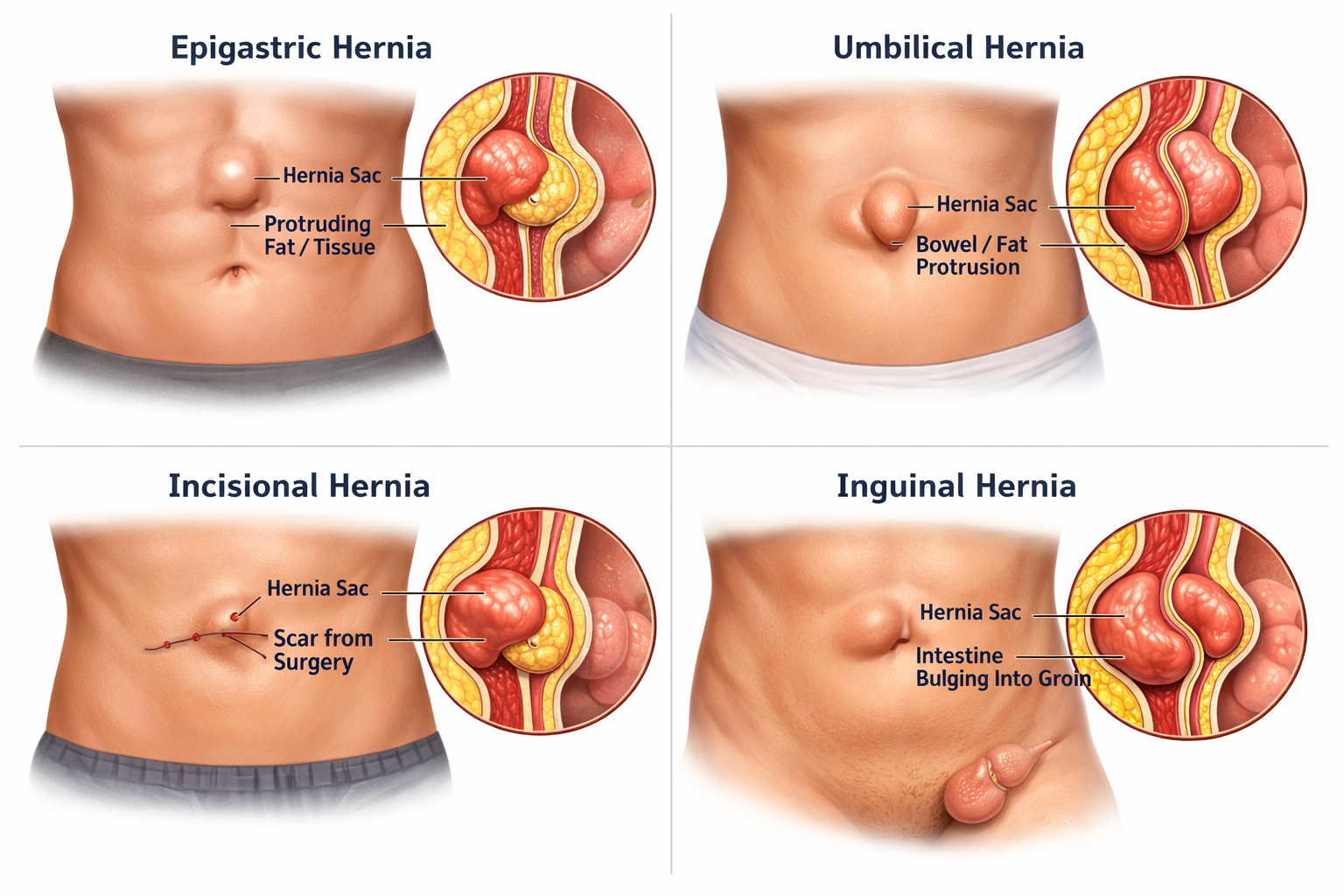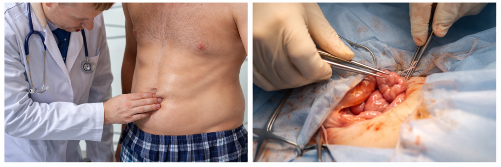 Abdominal hernias occur when internal tissue pushes through weakened abdominal muscles, causing a bulge or discomfort.